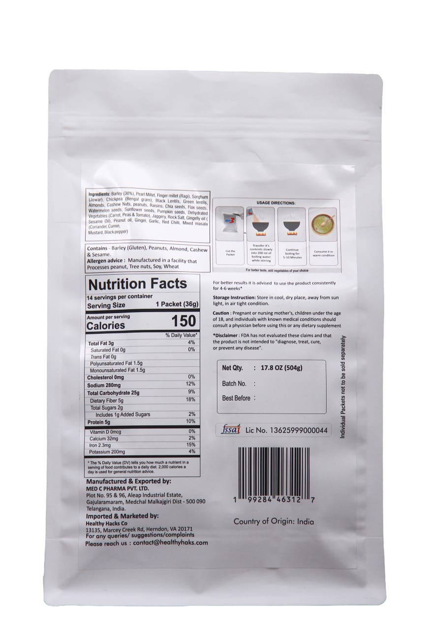 Barley (30%), Pearl Millet, Finger millet (Ragi), Sorghum (Jowar), Chickpea (Bengal gram), Black Lentils, Green lentils, Almonds, Cashew Nuts, peanuts, Raisins, Chia seeds, Flax seeds, Watermelon seeds, Sunflower seeds, Pumpkin seeds, Dehydrated Vegetables (Carrot, Peas & Tomato), Jaggery, Rock Salt, Gingelly oil ( Sesame Oil), Peanut oil, Ginger, Garlic, Red Chilli, Mixed masala (Coriander, Cumin, Mustard, Black pepper)